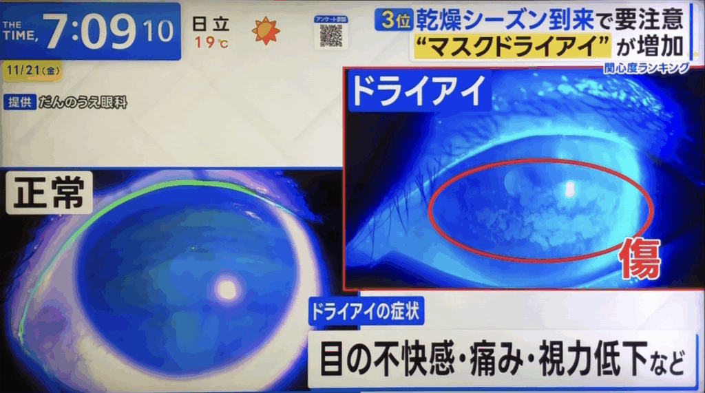 空気が非常に乾燥する中、感染対策でマスクを使用する方が増え、眼の不調を訴える方も増加しています。目に空気が当たって傷をつくることでドライアイを引き起こす状態を「マスクドライアイ」といいます。対策としては、マスクの鼻の部分をやや下めにフィットさせることが効果的です。